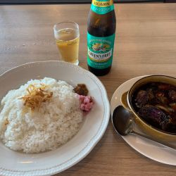 「出張」で那覇に到着。さて、沖縄そばでも…と思いましたが、なぜかカレーに惹かれてこちらへ。カシミールビーフカレー、ご飯大盛り無料とのことでしたので、ノンアルと一緒にそれで注文。ビーフも野菜もウマシ、ピリリと感じる辛さ、スパイシーさも良好。窓外のシップを見ながらのんびり頂きました。